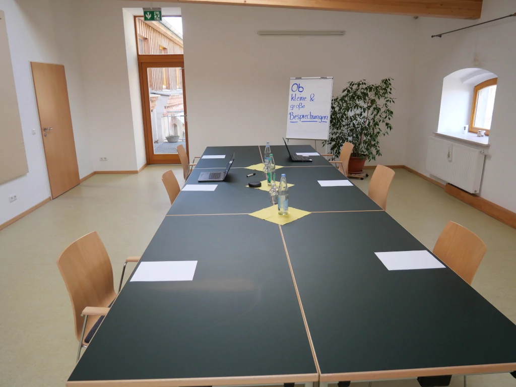 Kostenloses WLAN, ein Beamer, ein Flipchart, zwei Pinnwände sowie ein Moderationskoffer werden für Sie bereitgestellt.