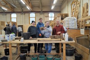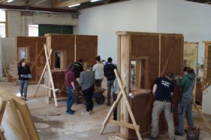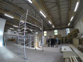 Die Halle bietet jetzt Raum für Praxis-Schulungen, u.a. zu Lehmbau, Strohballenbau, Innendämmung und Luftdichtigkeit. Hier befinden sich aber auch mehrere Seminarräume und ein großer Veranstaltungs-Saal.
